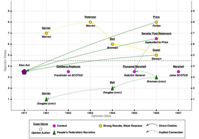 In chronological order, the cases giving rise to the Supreme Court opinions on the map are: Garner v. Louisiana, 368 U.S. 157 (1961); , (1962); Peterson v. City of Greenville, 373 U.S. 244 (1963); Bell v. Maryland, 378 U.S. 226 (1964); United States v. Guest, 383 U.S. 745 (1966); United States v. Price, 383 U.S. 787 (1966).
