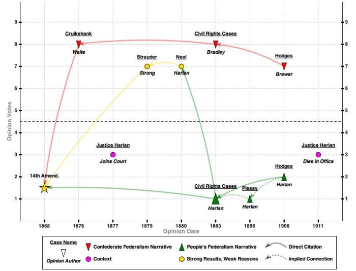 Map 3 illustrates Part II.C of the article (“The Competing Interpretation: A New Charter of Freedom”). In this section, we show how the People’s narrative arrived in Supreme Court doctrine via a series of critical dissents by Justice Harlan. Although earlier cases like Strauder and Neal had reached good civil-rights results, their justification was weak. In contrast, Harlan’s dissent in the Civil Rights Cases recognized that Reconstruction created a new fundamental right of civil freedom inhering in American citizenship.